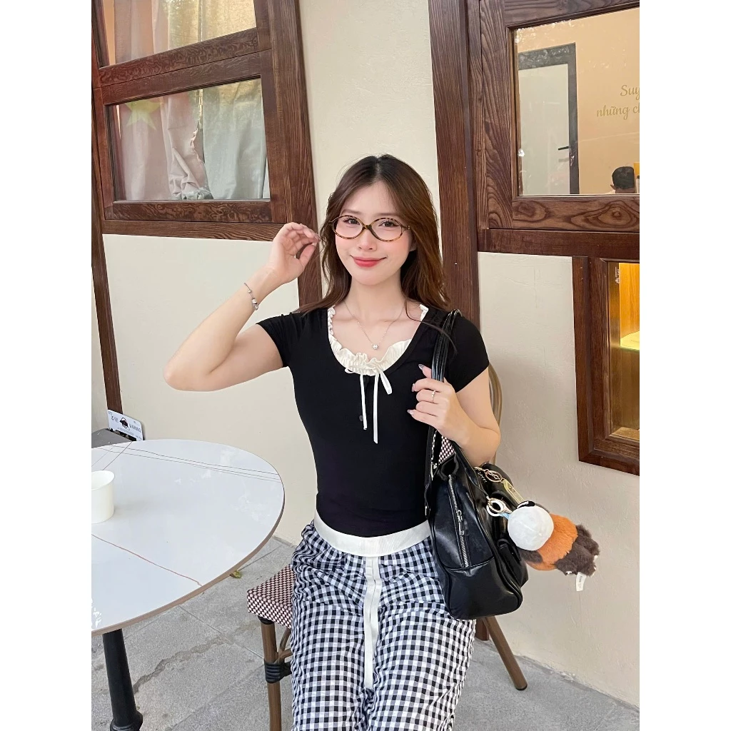 • Áo thun phối bèo buộc dây nữ tính